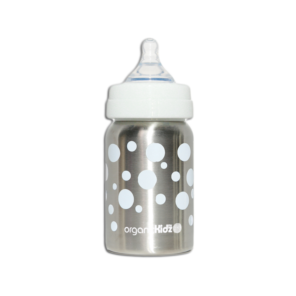 OrganicKidz award winning 9oz white polka dots stainless steel wide mouthed baby bottle.