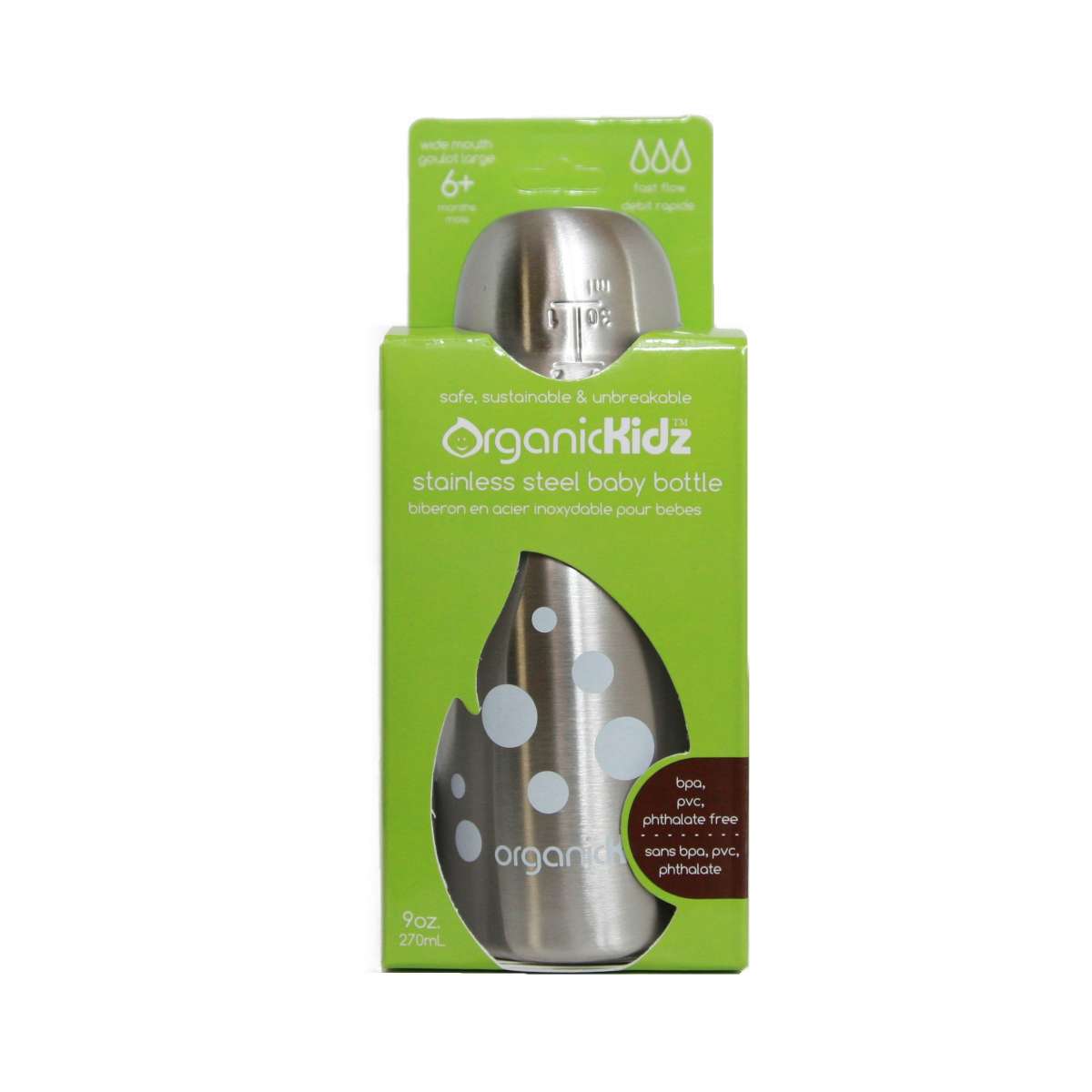 All organicKidz products are BPS, BPA, PVC, phthalate and lead free. Unlike glass and plastic baby bottles, stainless steel is unbreakable